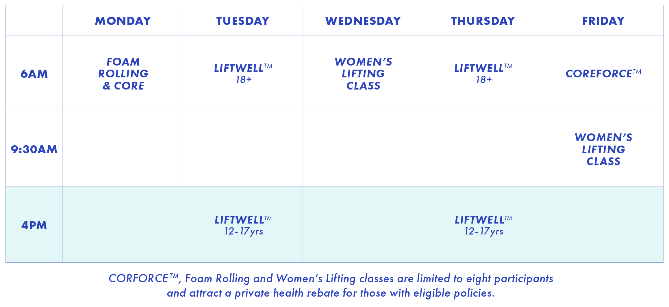 MEMBER NOTICEBOARDSpring Group Training kicks off Monday 20 October.Join us for Foam Rolling + Core, COREFORCE™, Women’s Lifting and LIFTWELL™.